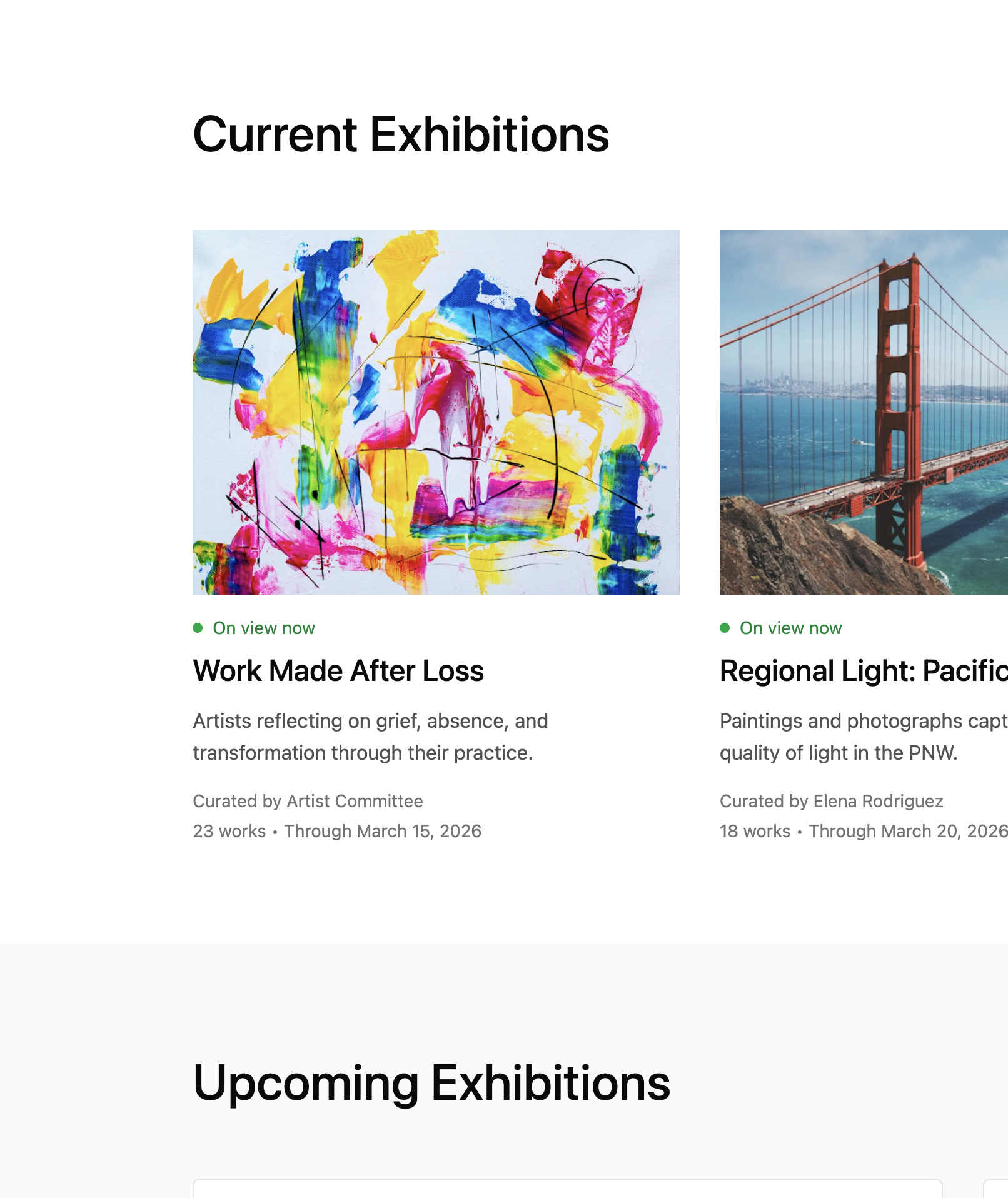Discovery without algorithmic overwhelm. Curated exhibitions and feeling-based browse filters as alternatives to the ranking systems that favor whoever already has an audience.