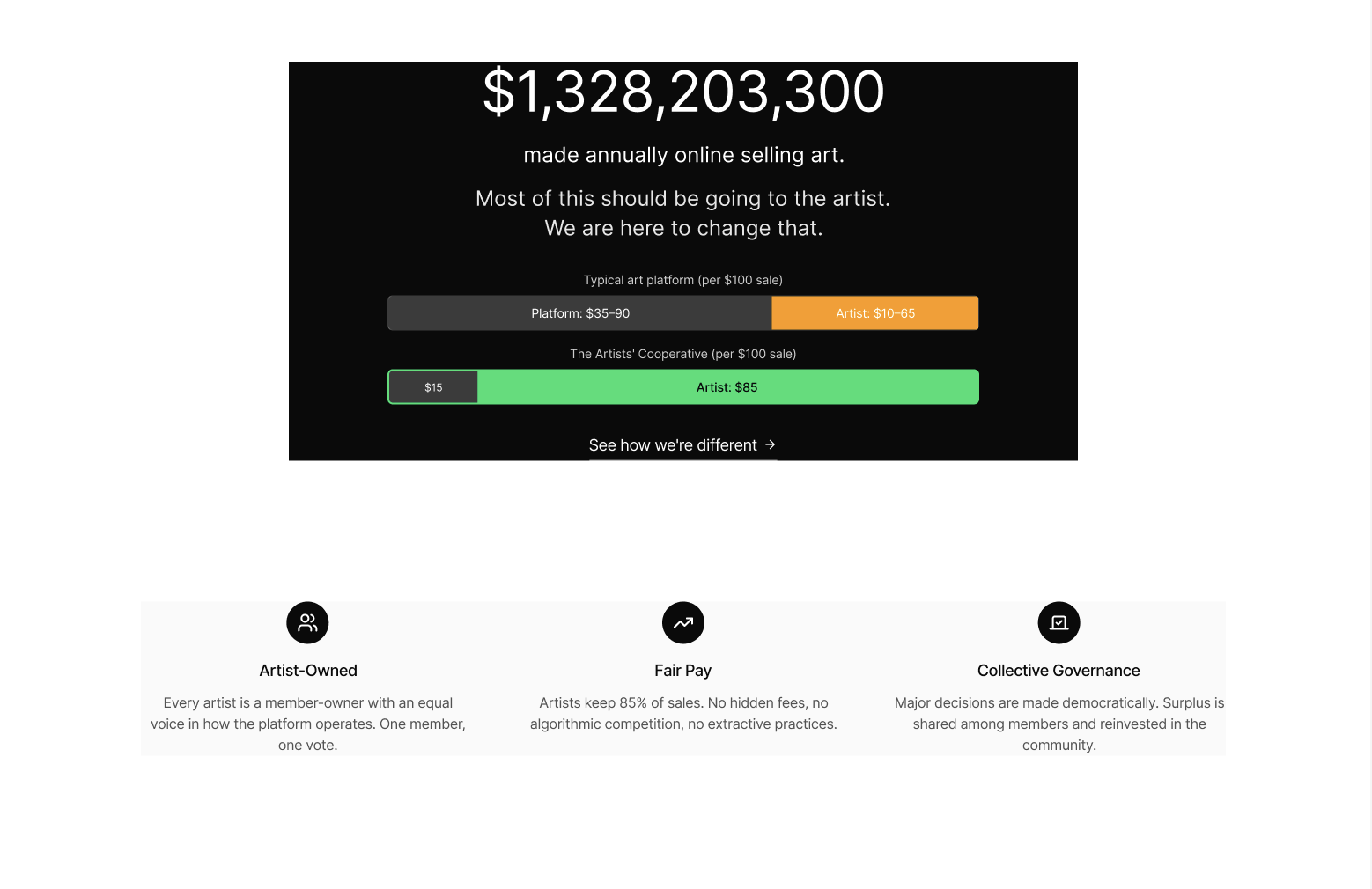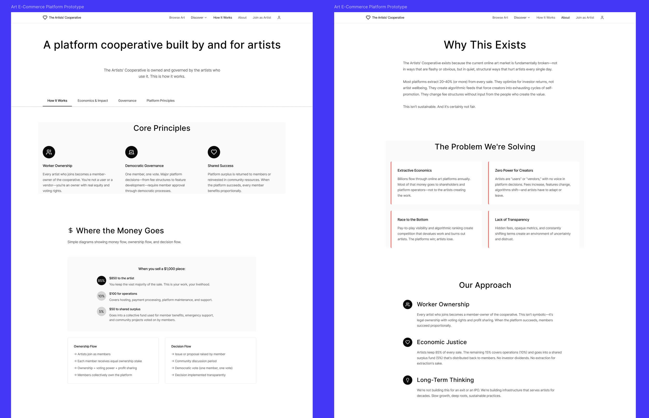 The online art economy is structurally extractive — commission structures on major marketplaces routinely take 30–50% of an artist's sale, while algorithms determine visibility in ways that favor volume over quality and established names over emerging work. I wanted to design a platform that took a different position: what if the people selling the art also owned the platform they sold it on?